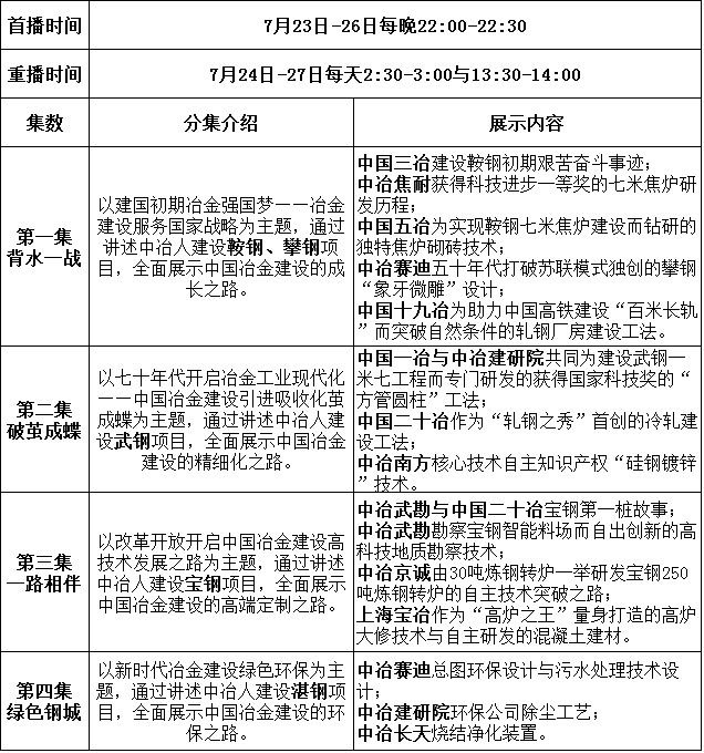 為貫徹落實國文清董事長關于“再談打造世界第一冶金建設國家隊問題”重要講話精神及集團年度工作會議精神,向慶祝中華人民共和國成立七十周年獻禮,展示中冶集團作為世界第一冶金建設國家隊的強大實力與品牌形象。中冶集團黨委宣傳部攜手13家子企業與央視國際頻道(CCTV-4)聯合打造四集《熔鑄九州》冶金建設國家隊專題紀錄片。7月23日-26日每晚22:00-22:30首次播出,次日2:30-3:00與13:30-14:00兩個時間段重復播出。