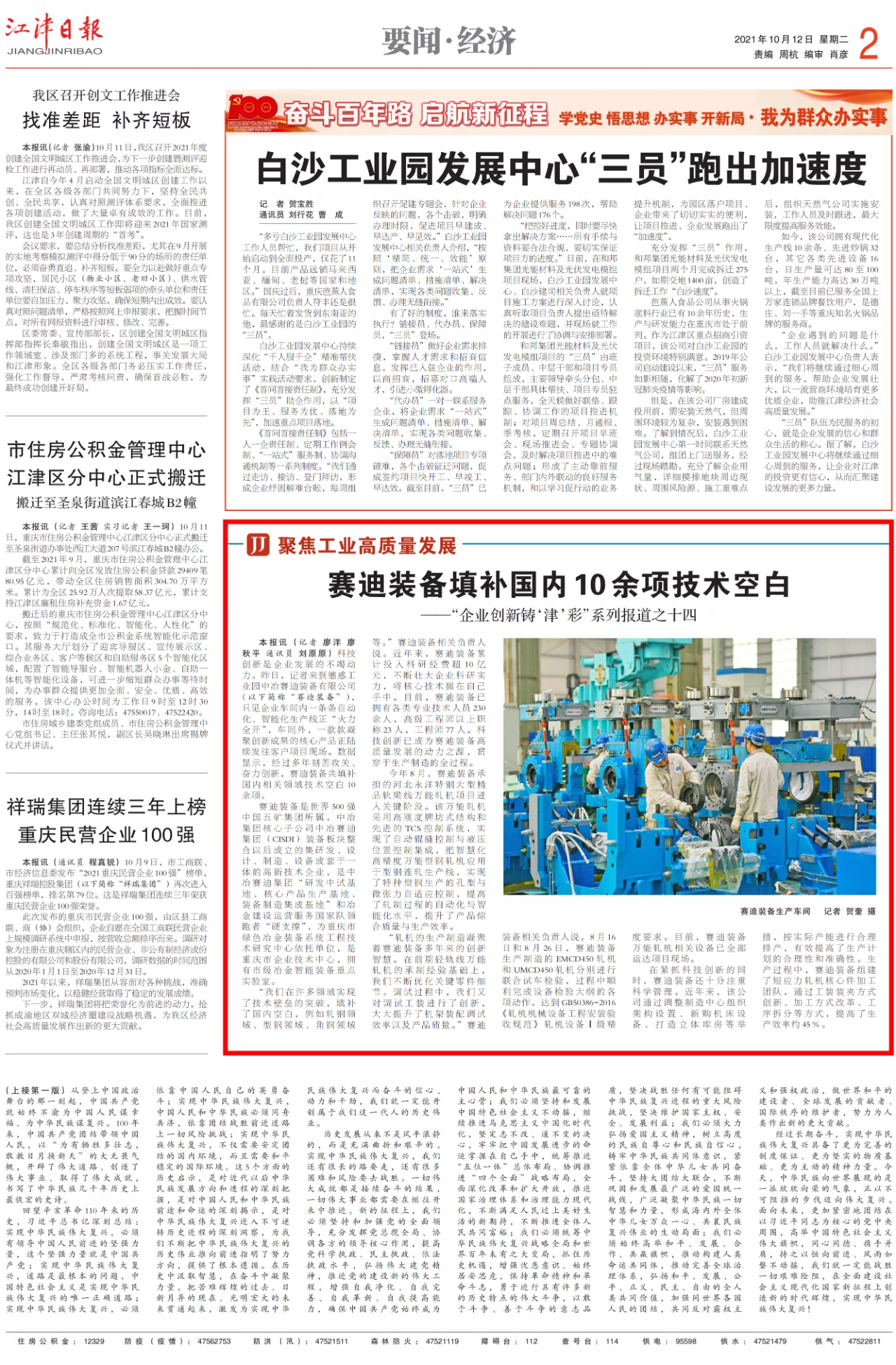 10月12日,《江津日報》第2版刊發“企業創新鑄‘津’彩”系列報道之十四《賽迪裝備填補國內10余項技術空白》,報道賽迪裝備經過多年刻苦攻關、奮力創新,共填補國內相關領域技術空白10余項。
