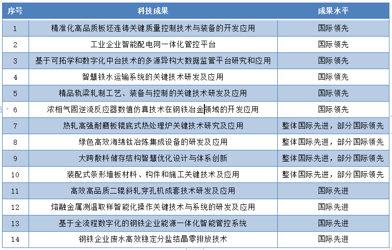 根據《中冶集團科技成果鑒定管理辦法》的規定,經中冶集團科技部組織,2022 年中冶賽迪共14項科技成果通過中冶集團科技成果鑒定,數量和質量在中冶集團子企業中均排名第一,且繼續保持100%達到國際先進及以上水平,其中6項成果達到國際領先水平,4項成果達到部分國際領先水平,名單見下。