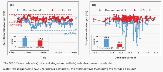 Compared with conventional BFs with the same burden design, it operates more stably and is more resistant to fluctuations in raw materials and fuels.
